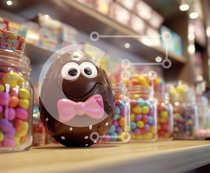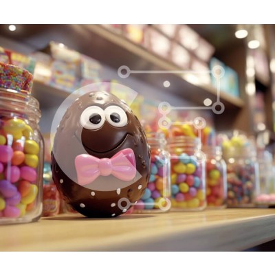 Υπάρχει δυνατότητα προσωποποίησης με δική σας φωτογραφία και προσαρμογής διαστάσεων κατόπιν παραγγελίας. Το συγεκεριμενο puzzle παρουσιαζει Η εικόνα δείχνει ένα ιδιότροπο πασχαλινό σοκολατένιο αυγό με ένα χαμογελαστό πρόσωπο και ένα ροζ παπιγιόν, τοποθετημένο σε περίοπτη θέση σε μια ξύλινη επιφάνεια. Γύρω από το αυγό υπάρχουν πολύχρωμα βάζα γεμάτα με διάφορες καραμέλες, συμπεριλαμβανομένων των λιχουδιών σε παστέλ