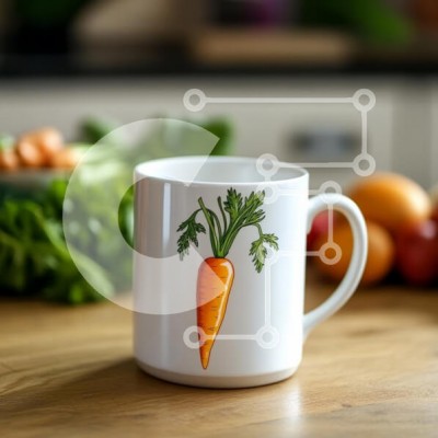 Υπάρχει δυνατότητα προσωποποίησης με δική σας φωτογραφία και προσαρμογής διαστάσεων κατόπιν παραγγελίας. Το συγεκεριμενο puzzle παρουσιαζει Αυτή η εικόνα παρουσιάζει μια λευκή κεραμική κούπα με μια πολύχρωμη απεικόνιση ενός καρότου στο πλάι της, σε ένα θολό φόντο από φρέσκα λαχανικά και φρούτα. Η κούπα τοποθετείται σε ξύλινη επιφάνεια, προσθέτοντας μια ζεστή και ρουστίκ αίσθηση στη σκηνή. Το ζωντανό πορτοκαλί του