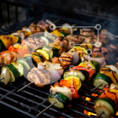 Υπάρχει δυνατότητα προσωποποίησης με δική σας φωτογραφία και προσαρμογής διαστάσεων κατόπιν παραγγελίας. Το συγεκεριμενο puzzle παρουσιαζει Η εικόνα παρουσιάζει μια ζωντανή ποικιλία από ψητά κεμπάπ σε μια σχάρα μπάρμπεκιου. Τα πολύχρωμα λαχανικά, όπως οι πιπεριές και τα κολοκυθάκια είναι διατεταγμένα με κομμάτια μαριναρισμένου κοτόπουλου, παρουσιάζοντας μια ποικιλία από υφές και χρώματα. Τα κεμπάπ τσουρουφλίζουν κ