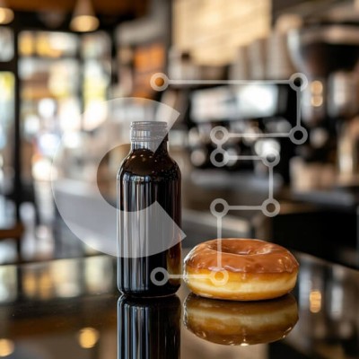 Υπάρχει δυνατότητα προσωποποίησης με δική σας φωτογραφία και προσαρμογής διαστάσεων κατόπιν παραγγελίας. Το συγεκεριμενο puzzle παρουσιαζει Αυτή η εικόνα παρουσιάζει ένα γυαλιστερό μαύρο μπουκάλι δίπλα σε ένα γυαλισμένο ντόνατ σε μια ανακλαστική επιφάνεια. Το φόντο υποδηλώνει μια ζεστή ατμόσφαιρα καφέ, με απαλό φωτισμό και θολά στοιχεία που υποδηλώνουν μια ζεστή ατμόσφαιρα. Το ντόνατ ολοκληρώνεται με ένα πλούσιο γ