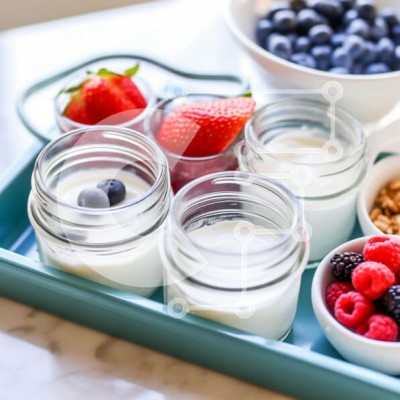 Υπάρχει δυνατότητα προσωποποίησης με δική σας φωτογραφία και προσαρμογής διαστάσεων κατόπιν παραγγελίας. Το συγεκεριμενο puzzle παρουσιαζει Αυτή η εικόνα δείχνει έναν μπλε δίσκο με διάφορα μπολ με γιαούρτι, μούρα και άλλα ορεκτικά φαγητά. Στο κέντρο του δίσκου, υπάρχουν τέσσερα μικρά βάζα γεμάτα με γιαούρτι, που περιβάλλονται από δύο μικρότερα ραμεκινάκια. Στο κάτω μέρος του δίσκου, τοποθετούνται τρεις μεγάλες κού