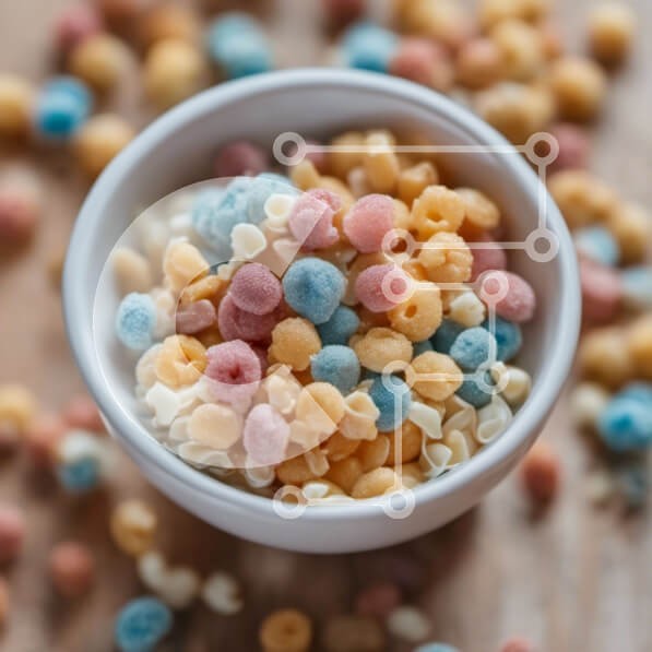 Υπάρχει δυνατότητα προσωποποίησης με δική σας φωτογραφία και προσαρμογής διαστάσεων κατόπιν παραγγελίας. Το συγεκεριμενο puzzle παρουσιαζει Αυτή η εικόνα παρουσιάζει ένα λευκό μπολ γεμάτο με ένα μείγμα από πολύχρωμα δημητριακά, συμπεριλαμβανομένων των μπλε, ροζ και κίτρινων ποικιλιών. Οι ψεκασμοί είναι διάσπαρτοι γύρω από το μπολ, προσθέτοντας μια παιχνιδιάρικη πινελιά. Η εικόνα επιτρέπει την εύκολη αναγνώριση των