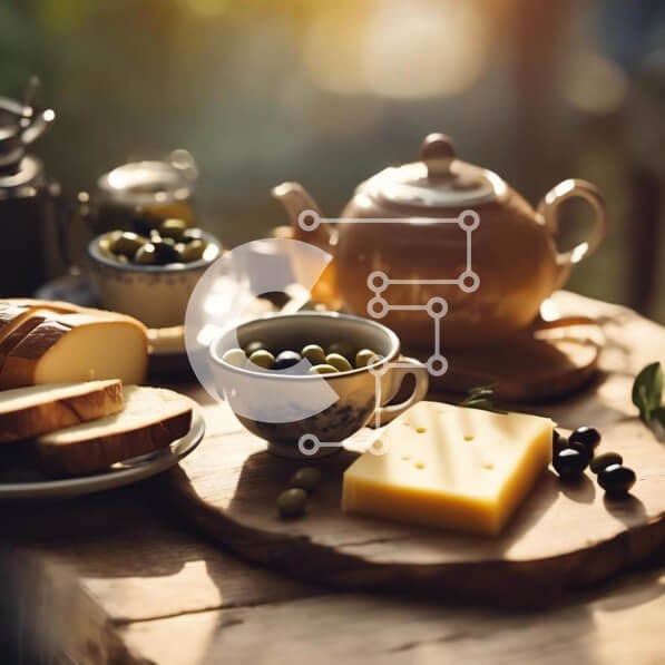 Υπάρχει δυνατότητα προσωποποίησης με δική σας φωτογραφία και προσαρμογής διαστάσεων κατόπιν παραγγελίας. Το συγεκεριμενο puzzle παρουσιαζει Η εικόνα δείχνει ένα ξύλινο τραπέζι στολισμένο με διάφορα απολαυστικά αντικείμενα, όπως ψωμί, ελιές, τσάι και τυρί. Πολλά φλιτζάνια τσάι τοποθετούνται στο τραπέζι, προσφέροντας μια φιλόξενη σκηνή για την προετοιμασία καφέ ή τσαγιού. Επιπλέον, στη σύνθεση περιλαμβάνονται επίσης