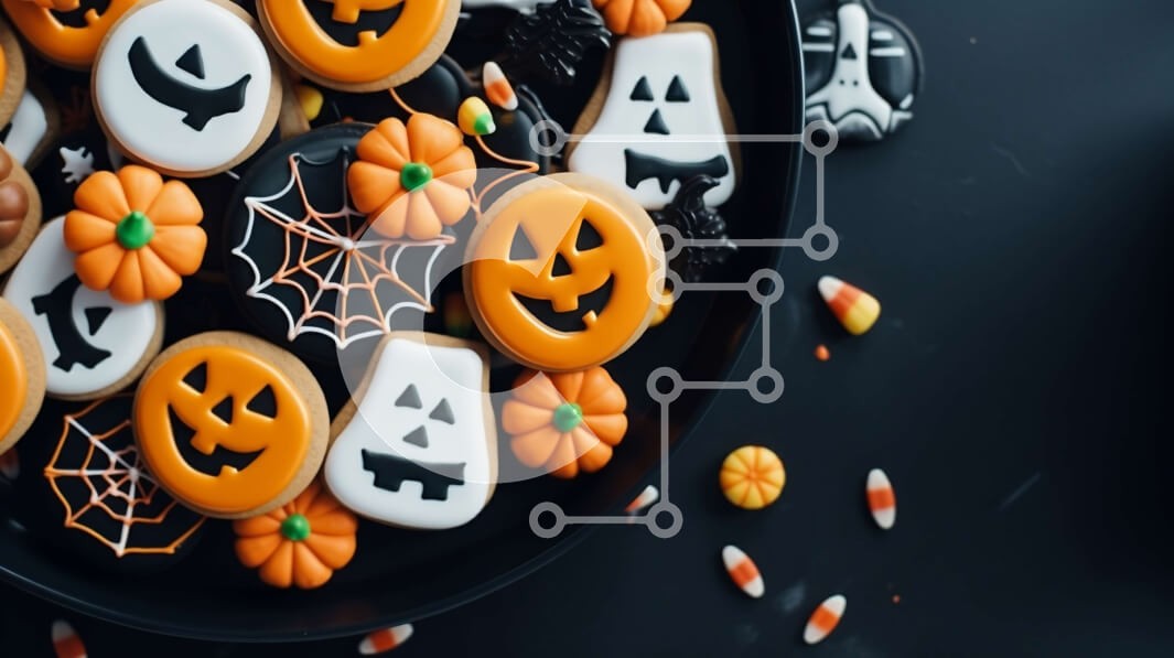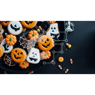 Υπάρχει δυνατότητα προσωποποίησης με δική σας φωτογραφία και προσαρμογής διαστάσεων κατόπιν παραγγελίας. Το συγεκεριμενο puzzle παρουσιαζει Αυτή η εικόνα δείχνει ένα πιάτο γεμάτο με διάφορα διακοσμημένα μπισκότα με θέμα το Halloween, συμπεριλαμβανομένων κολοκύθες και φαναράκια jack-o'. Τα μπισκότα τοποθετούνται πάνω σε πορτοκαλί φόντο, δημιουργώντας μια εορταστική ατμόσφαιρα. Σε πρώτο πλάνο, υπάρχουν επίσης κομμάτ