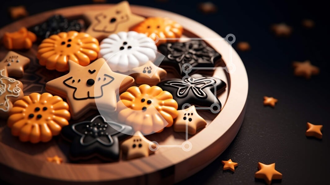 Υπάρχει δυνατότητα προσωποποίησης με δική σας φωτογραφία και προσαρμογής διαστάσεων κατόπιν παραγγελίας. Το συγεκεριμενο puzzle παρουσιαζει Αυτή η εικόνα παρουσιάζει ένα πιάτο με μπισκότα διακοσμημένα με αστέρια, νυχτερίδες και φαντάσματα. Τα μπισκότα τοποθετούνται πάνω από μια ξύλινη πιατέλα σε σχήμα οβάλ, η οποία μπορεί να χρησιμοποιηθεί για την εμφάνιση ή το σερβίρισμα των μπισκότων. Υπάρχουν επίσης αρκετές μικ