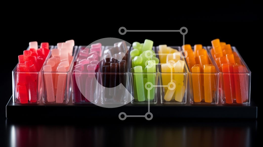 Υπάρχει δυνατότητα προσωποποίησης με δική σας φωτογραφία και προσαρμογής διαστάσεων κατόπιν παραγγελίας. Το συγεκεριμενο puzzle παρουσιαζει Αυτή η εικόνα παρουσιάζει μια ποικιλία από πολύχρωμες κολλώδεις καραμέλες που εμφανίζονται σε διαφανή δοχεία τακτοποιημένα σε μαύρο φόντο. Οι καραμέλες είναι σε διάφορα σχήματα και μεγέθη, κυρίως μπαστούνια, και διατίθενται σε μια ζωντανή σειρά χρωμάτων, όπως κόκκινο, ροζ, πρά