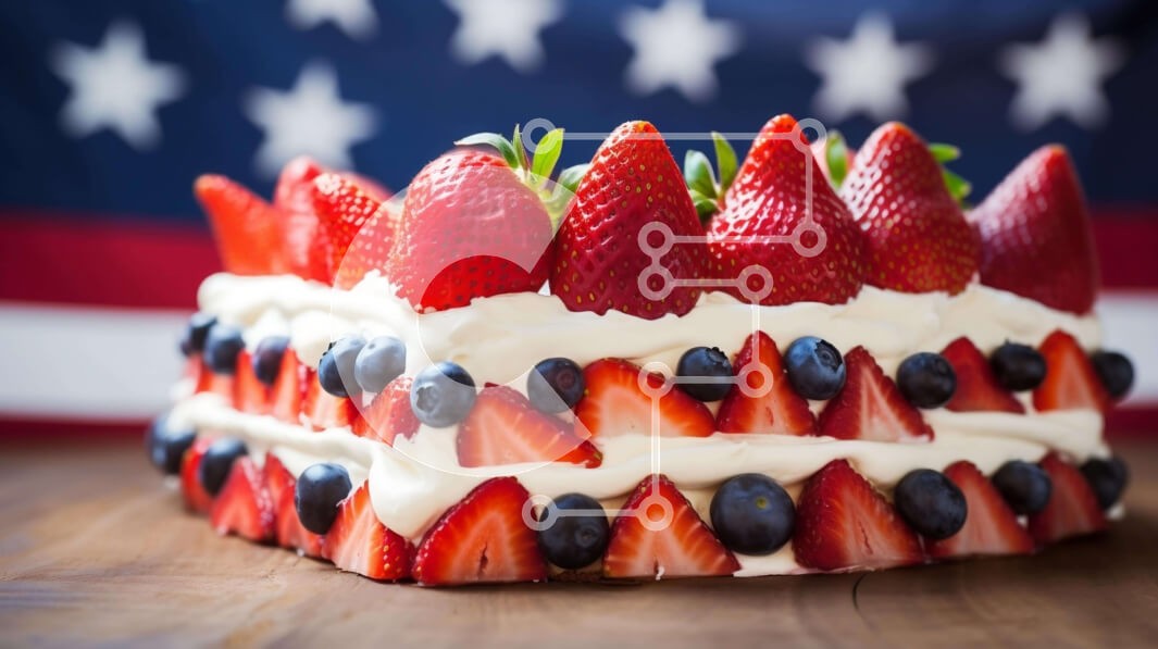 Υπάρχει δυνατότητα προσωποποίησης με δική σας φωτογραφία και προσαρμογής διαστάσεων κατόπιν παραγγελίας. Το συγεκεριμενο puzzle παρουσιαζει Η εικόνα δείχνει μια τούρτα στολισμένη με φράουλες, βατόμουρα και λευκό γλάσο σε σχήμα αμερικανικής σημαίας. Τοποθετείται σε ξύλινες σανίδες, υποδεικνύοντας πιθανώς μια εσωτερική ή εξωτερική ρύθμιση. Το τραπέζι περιλαμβάνει επίσης μια ποικιλία από φρούτα, όπως μήλα, σταφύλια,