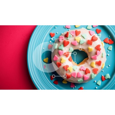 Υπάρχει δυνατότητα προσωποποίησης με δική σας φωτογραφία και προσαρμογής διαστάσεων κατόπιν παραγγελίας. Το συγεκεριμενο puzzle παρουσιαζει Αυτή η εικόνα παρουσιάζει ένα ντόνατ με πολύχρωμα ψεκάσματα και καρδιές τοποθετημένες στη μέση ενός οβάλ σχήματος μπλε πιάτου. Πολύχρωμες καρδιές είναι διάσπαρτες γύρω από το ντόνατ, δημιουργώντας μια εορταστική και ελκυστική εμφάνιση. Υπάρχουν επίσης μικρές κουκκίδες στο επάν