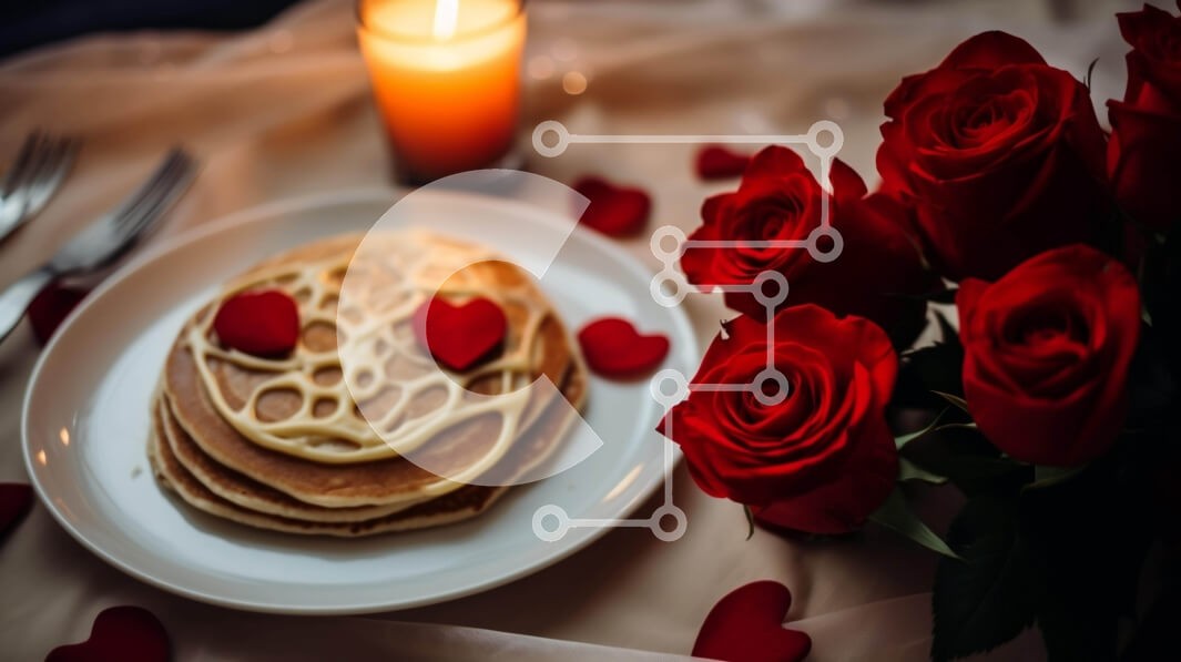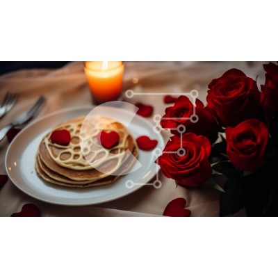 Υπάρχει δυνατότητα προσωποποίησης με δική σας φωτογραφία και προσαρμογής διαστάσεων κατόπιν παραγγελίας. Το συγεκεριμενο puzzle παρουσιαζει Αυτή η εικόνα παρουσιάζει ένα όμορφα τοποθετημένο πιάτο με τηγανίτες με τριαντάφυλλα ως κομψή διακόσμηση. Ένα κερί τοποθετείται στη μέση του τραπεζιού, προσθέτοντας μια ρομαντική πινελιά στη σκηνή. Δύο πιρούνια, χαρτοπετσέτες και σκεύη είναι τακτοποιημένα σε κοντινή απόσταση,