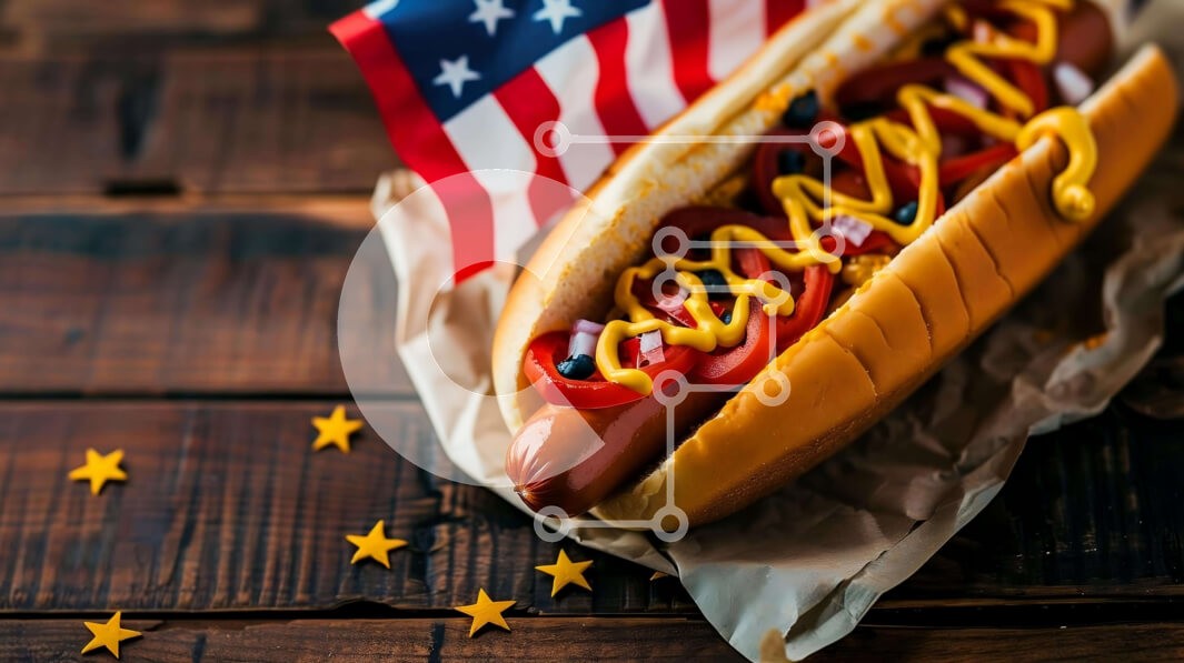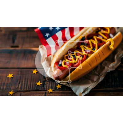 Υπάρχει δυνατότητα προσωποποίησης με δική σας φωτογραφία και προσαρμογής διαστάσεων κατόπιν παραγγελίας. Το συγεκεριμενο puzzle παρουσιαζει Η εικόνα απεικονίζει ένα κουλούρι για χοτ-ντογκ με μουστάρδα, απόλαυση και μια αμερικανική σημαία από πάνω. Το τσουρέκι είναι τυλιγμένο σε καφέ χαρτί, το οποίο μπορεί να χρησιμοποιηθεί για το τύλιγμα ή το τύλιγμα των τροφίμων. Υπάρχουν πολλά αστέρια διάσπαρτα γύρω από το κουλο