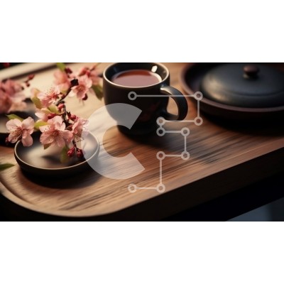 Υπάρχει δυνατότητα προσωποποίησης με δική σας φωτογραφία και προσαρμογής διαστάσεων κατόπιν παραγγελίας. Το συγεκεριμενο puzzle παρουσιαζει Αυτή η εικόνα δείχνει μια γαλήνια και αισθητικά ευχάριστη ρύθμιση τσαγιού. Ένα σκούρο κεραμικό φλιτζάνι γεμάτο με τσάι τοποθετείται σε περίοπτη θέση σε έναν όμορφα φτιαγμένο ξύλινο δίσκο. Γύρω από το κύπελλο υπάρχουν ευαίσθητα ροζ άνθη κερασιάς που προσθέτουν μια πινελιά κομψό
