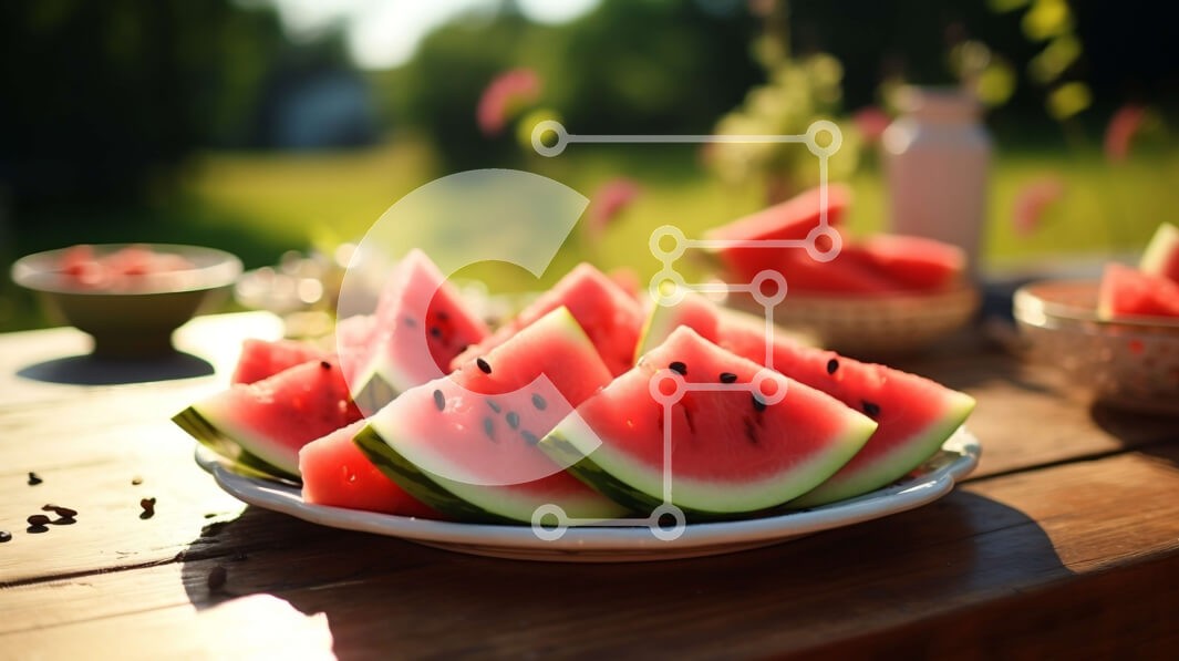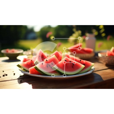 Υπάρχει δυνατότητα προσωποποίησης με δική σας φωτογραφία και προσαρμογής διαστάσεων κατόπιν παραγγελίας. Το συγεκεριμενο puzzle παρουσιαζει Αυτή η εικόνα παρουσιάζει ένα πιάτο με κομμένο καρπούζι, τοποθετημένο σε κύκλο σε ένα ξύλινο τραπέζι, με φύλλα και μίσχους στο πλάι. Οι φέτες καρπουζιού είναι ζωηρό κόκκινο και φαίνονται ζουμερές και φρέσκες. Υπάρχουν επίσης μικρά λουλούδια σε ένα βάζο και βότανα που φυτρώνουν