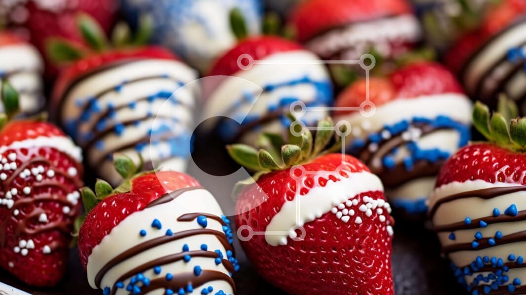 Υπάρχει δυνατότητα προσωποποίησης με δική σας φωτογραφία και προσαρμογής διαστάσεων κατόπιν παραγγελίας. Το συγεκεριμενο puzzle παρουσιαζει Αυτή η εικόνα παρουσιάζει έναν δίσκο με φράουλες στολισμένο με κόκκινα, λευκά και μπλε πασπαλίσματα. Οι φράουλες είναι τακτοποιημένες σε σειρές στο ταψί, κάθε μια ντυμένη με λευκή σοκολάτα. Μερικές φράουλες έχουν επιπλέον διακοσμητικά όπως αστέρια και ρίγες, προσθέτοντας στη γ