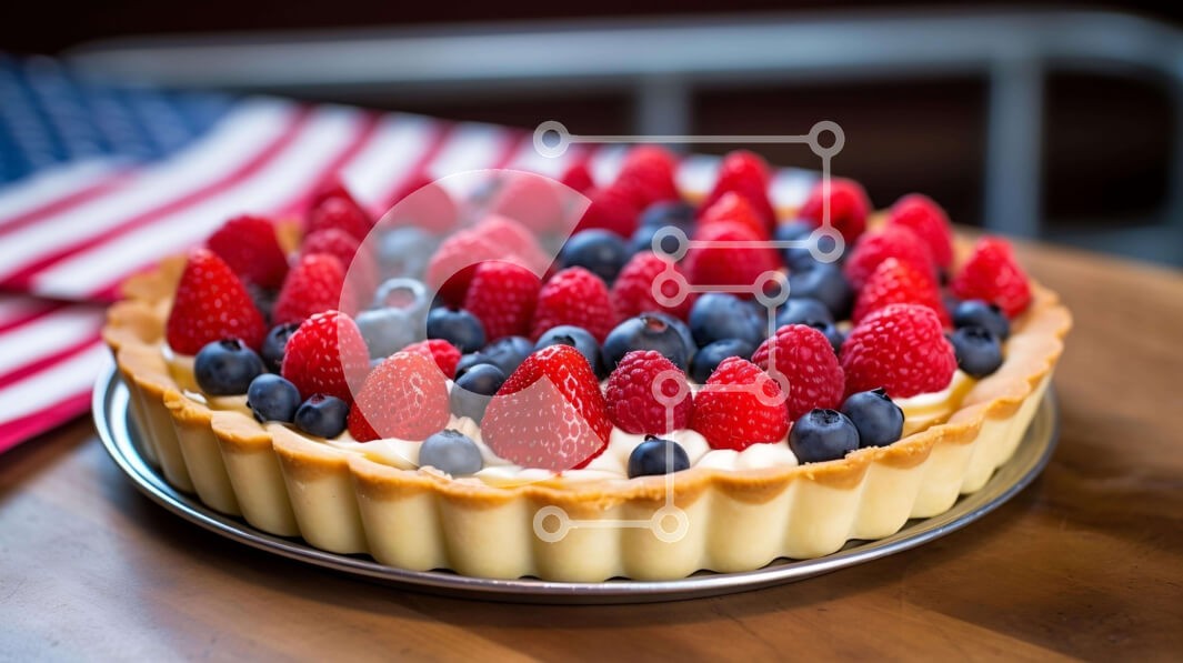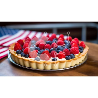 Υπάρχει δυνατότητα προσωποποίησης με δική σας φωτογραφία και προσαρμογής διαστάσεων κατόπιν παραγγελίας. Το συγεκεριμενο puzzle παρουσιαζει Αυτή η εικόνα παρουσιάζει μια φρέσκια τάρτα με μούρα διακοσμημένη με μια διακόσμηση αμερικανικής σημαίας, τοποθετημένη σε ένα τραπέζι. Γύρω από την τάρτα υπάρχουν φράουλες, σμέουρα και βατόμουρα, δημιουργώντας μια ζωντανή και ορεκτική οθόνη. Ένα μοναδικό puzzle που συνδυάζει