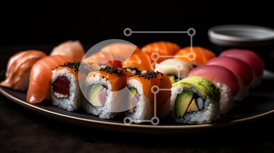 Υπάρχει δυνατότητα προσωποποίησης με δική σας φωτογραφία και προσαρμογής διαστάσεων κατόπιν παραγγελίας. Το συγεκεριμενο puzzle παρουσιαζει Αυτή η εικόνα δείχνει ένα πιάτο σούσι με διάφορα είδη ψαριών, λαχανικών και σάλτσες. Τα ρολά σούσι συσκευάζονται σφιχτά και κόβονται σε μικρά κομμάτια. Το ψάρι είναι φρέσκο και πολύχρωμο, από απαλό ροζ έως βαθύ κόκκινο. Τα λαχανικά είναι τραγανά και ζωντανά, όπως το αγγούρι,