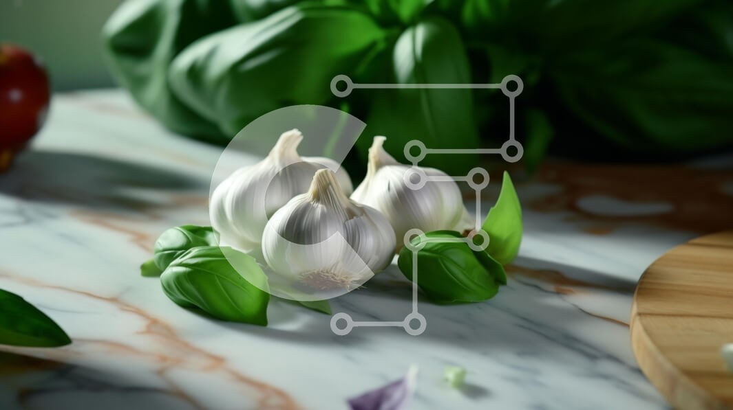 Υπάρχει δυνατότητα προσωποποίησης με δική σας φωτογραφία και προσαρμογής διαστάσεων κατόπιν παραγγελίας. Το συγεκεριμενο puzzle παρουσιαζει Η εικόνα δείχνει έναν μαρμάρινο πάγκο στολισμένο με σκελίδες σκόρδου, φύλλα βασιλικού και ένα μήλο, υποδεικνύοντας συστατικά για γαστρονομικές δημιουργίες όπως σαλάτες ή σούπες. Ένα κοντινό ξύλο κοπής υποδηλώνει την προετοιμασία του σκόρδου. Η σκηνή αποπνέει ατμόσφαιρα μαγειρι