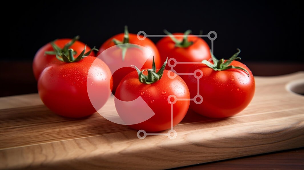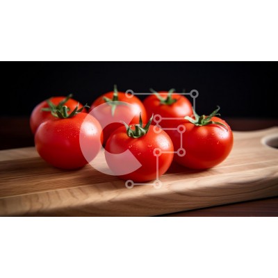 Υπάρχει δυνατότητα προσωποποίησης με δική σας φωτογραφία και προσαρμογής διαστάσεων κατόπιν παραγγελίας. Το συγεκεριμενο puzzle παρουσιαζει Αυτή η εικόνα παρουσιάζει έξι φρέσκες, ζωηρές κόκκινες ντομάτες με πράσινους μίσχους, τακτοποιημένες σε μια ξύλινη σανίδα κοπής. Οι ντομάτες γυαλίζουν με σταγονίδια νερού, αναδεικνύοντας τη φρεσκάδα τους. Το φόντο είναι σκούρο, γεγονός που ενισχύει το ζωηρό χρώμα της ντομάτας