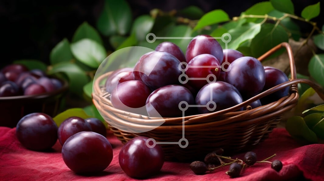 Υπάρχει δυνατότητα προσωποποίησης με δική σας φωτογραφία και προσαρμογής διαστάσεων κατόπιν παραγγελίας. Το συγεκεριμενο puzzle παρουσιαζει Αυτή η εικόνα παρουσιάζει ένα καλάθι γεμάτο με δαμάσκηνα σε ένα κόκκινο τραπεζομάντιλο. Τα δαμάσκηνα έχουν βαθύ μωβ χρώμα, υποδηλώνοντας την ωρίμανση τους. Το φόντο περιλαμβάνει μερικά φύλλα, υποδηλώνοντας ότι τα δαμάσκηνα μπορεί να προέρχονται από δέντρο ή περιβόλι. Ένα μονα
