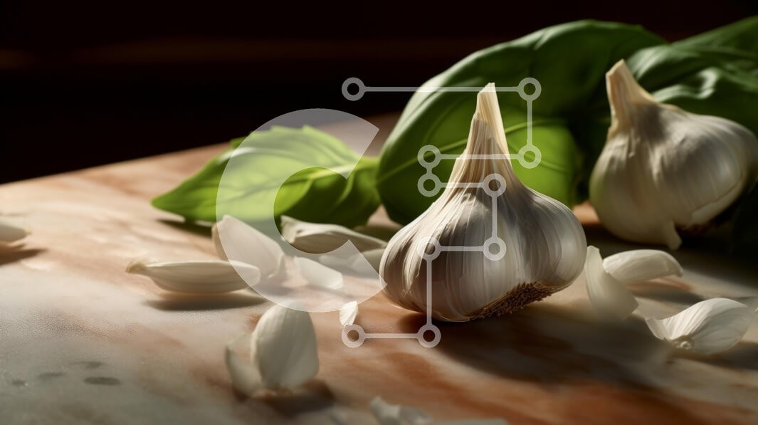 Υπάρχει δυνατότητα προσωποποίησης με δική σας φωτογραφία και προσαρμογής διαστάσεων κατόπιν παραγγελίας. Το συγεκεριμενο puzzle παρουσιαζει Η εικόνα παρουσιάζει δύο βολβούς σκόρδου σε μια ξύλινη σανίδα κοπής, μαζί με φρέσκα φύλλα βασιλικού. Το σκόρδο τοποθετείται στη μέση του τραπεζιού, ενώ το φύλλο βασιλικού είναι στο πλάι. Αυτά τα συστατικά είναι πιθανό να χρησιμοποιηθούν για μαγείρεμα ή ψήσιμο. Ένα μοναδικό pu