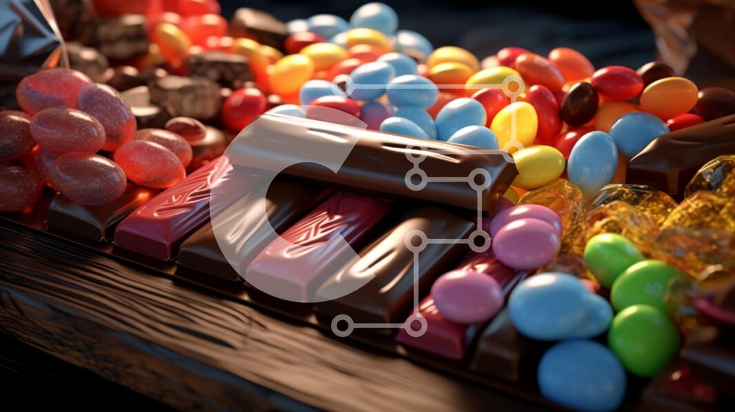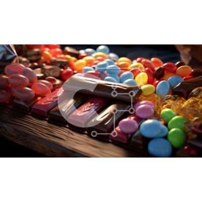 Υπάρχει δυνατότητα προσωποποίησης με δική σας φωτογραφία και προσαρμογής διαστάσεων κατόπιν παραγγελίας. Το συγεκεριμενο puzzle παρουσιαζει Αυτή η εικόνα παρουσιάζει μια σειρά από πολύχρωμες καραμέλες και σοκολάτες που παρουσιάζονται έντεχνα μαζί. Η ποικιλία περιλαμβάνει διάφορους τύπους μπάρες σοκολάτας με γυαλιστερά περιτυλίγματα, ζελέ φασόλια και άλλες γλυκές λιχουδιές σε ζωηρές αποχρώσεις. Η σύνθεση είναι οπτι