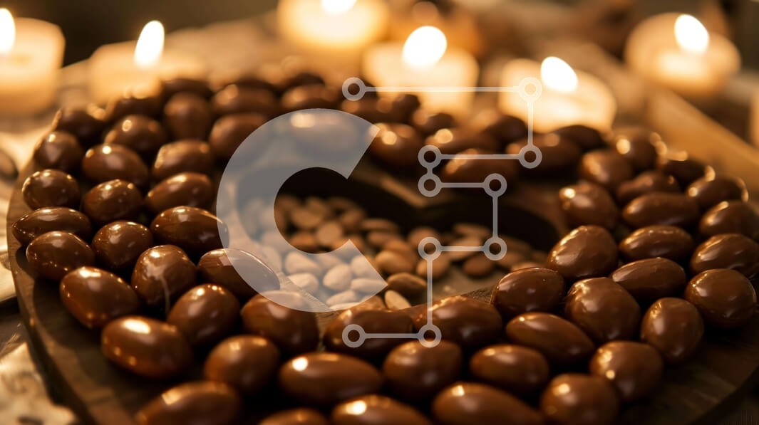 Υπάρχει δυνατότητα προσωποποίησης με δική σας φωτογραφία και προσαρμογής διαστάσεων κατόπιν παραγγελίας. Το συγεκεριμενο puzzle παρουσιαζει Η εικόνα παρουσιάζει μια σύνθεση σε σχήμα καρδιάς από σοκολάτα και αμύγδαλα, που περιβάλλεται από κεριά. Υπάρχουν διάφορα είδη ξηρών καρπών στο τραπέζι, συμπεριλαμβανομένων των φουντουκιών και των πεκάν. Μερικοί από τους ξηρούς καρπούς φαίνεται να έχουν σκούρο χρώμα, υποδηλώνο
