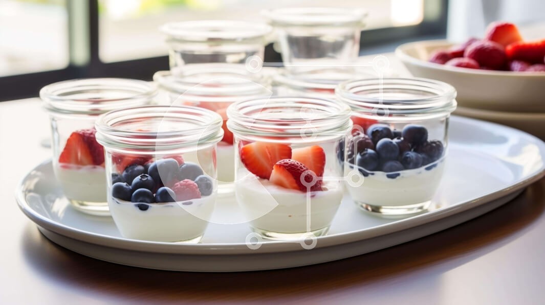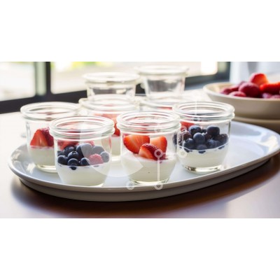 Υπάρχει δυνατότητα προσωποποίησης με δική σας φωτογραφία και προσαρμογής διαστάσεων κατόπιν παραγγελίας. Το συγεκεριμενο puzzle παρουσιαζει Αυτή η εικόνα παρουσιάζει ένα λευκό πιάτο γεμάτο με μικρά βάζα που περιέχουν γιαούρτι και μια ποικιλία από φρέσκα φρούτα, συμπεριλαμβανομένων των μούρων. Επιπλέον, στο τραπέζι υπάρχουν μπολ με φρούτα, υποδηλώνοντας ότι το γλυκό μπορεί να σερβιριστεί με διαφορετικούς τρόπους. Η
