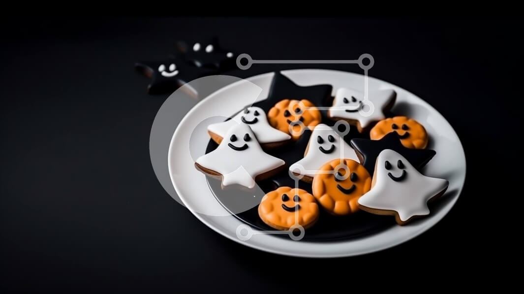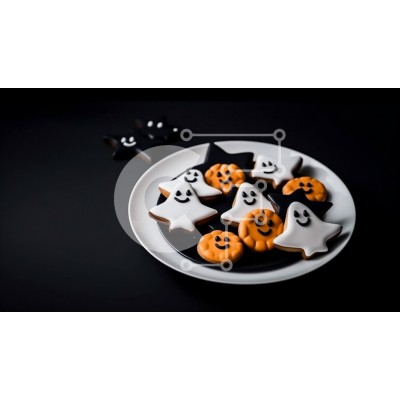 Υπάρχει δυνατότητα προσωποποίησης με δική σας φωτογραφία και προσαρμογής διαστάσεων κατόπιν παραγγελίας. Το συγεκεριμενο puzzle παρουσιαζει Αυτή η εικόνα δείχνει ένα λευκό πιάτο με πολλά μπισκότα διακοσμημένα με σχέδια φαντασμάτων και κολοκύθας. Τα μπισκότα αποτελούν μέρος ενός περίτεχνου αποκριάτικου πάρτι και υπάρχουν πρόσθετα διακοσμητικά τοποθετημένα γύρω από το πιάτο, όπως cupcakes ή ζαχαρωτά. Ένα μοναδικό p