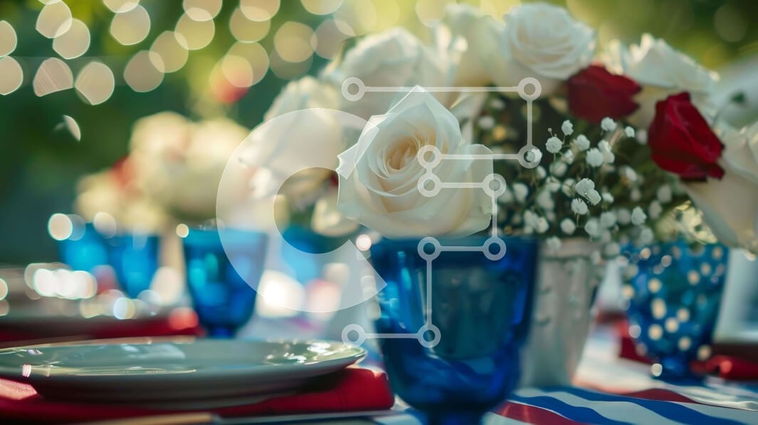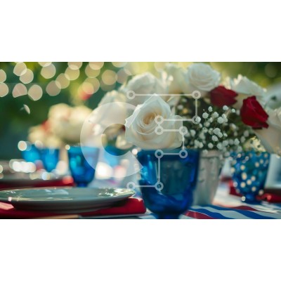 Υπάρχει δυνατότητα προσωποποίησης με δική σας φωτογραφία και προσαρμογής διαστάσεων κατόπιν παραγγελίας. Το συγεκεριμενο puzzle παρουσιαζει Η εικόνα δείχνει ένα όμορφα διαρρυθμισμένο τραπέζι με κόκκινα, λευκά και μπλε πιάτα, χαρτοπετσέτες, φλιτζάνια, ποτήρια και λουλούδια. Ασημικά αντικείμενα όπως πιρούνια και μαχαίρια τοποθετούνται κομψά στο τραπέζι. Μια διάταξη φόντου από λευκά τριαντάφυλλα προσθέτει στην αισθητ