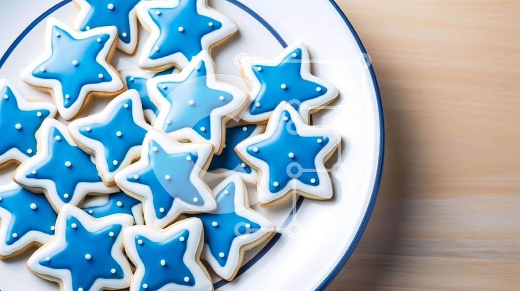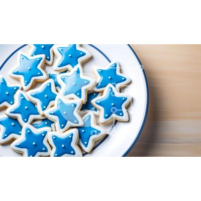 Υπάρχει δυνατότητα προσωποποίησης με δική σας φωτογραφία και προσαρμογής διαστάσεων κατόπιν παραγγελίας. Το συγεκεριμενο puzzle παρουσιαζει Αυτή η εικόνα παρουσιάζει ένα λευκό πιάτο με μπλε και λευκά μπισκότα σε σχήμα αστεριού πάνω του. Τα μπισκότα διακοσμούνται με βασιλικό γλάσο ή ζάχαρη άχνη, δίνοντάς τους μια δελεαστική εμφάνιση. Το πιάτο τοποθετείται πάνω από ένα ημιτελές ξύλινο τραπέζι, προσθέτοντας μια ρουστ