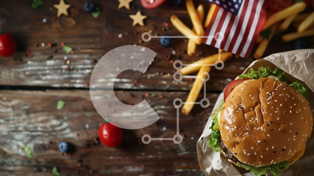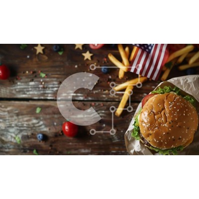 Υπάρχει δυνατότητα προσωποποίησης με δική σας φωτογραφία και προσαρμογής διαστάσεων κατόπιν παραγγελίας. Το συγεκεριμενο puzzle παρουσιαζει Η εικόνα απεικονίζει ένα χάμπουργκερ, πατάτες και μια αμερικανική σημαία στο βάθος. Το χάμπουργκερ είναι τυλιγμένο σε χαρτί και κάθεται πάνω από μερικές τηγανητές πατάτες που είναι διάσπαρτες γύρω από την επιφάνεια του τραπεζιού. Υπάρχουν επίσης αρκετά κομμάτια φρούτων σε κοντ