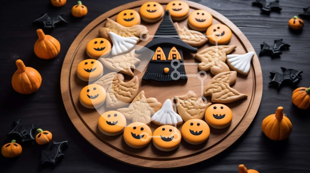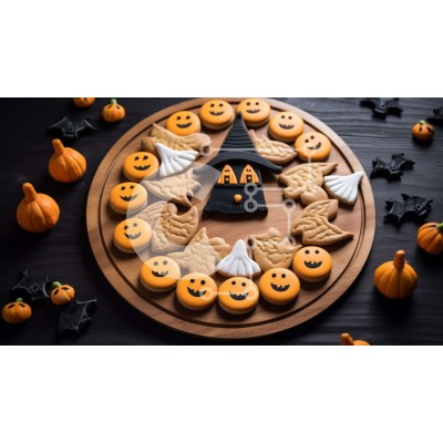Υπάρχει δυνατότητα προσωποποίησης με δική σας φωτογραφία και προσαρμογής διαστάσεων κατόπιν παραγγελίας. Το συγεκεριμενο puzzle παρουσιαζει Αυτή η εικόνα παρουσιάζει μπισκότα, κολοκύθες, μάγισσες και νυχτερίδες με θέμα το Halloween σε μια ξύλινη σανίδα κοπής. Τα μπισκότα είναι περίπλοκα σχεδιασμένα και μπορούν να χρησιμοποιηθούν ως εορταστικές λιχουδιές για αποκριάτικα πάρτι ή εκδηλώσεις. Η ξύλινη σανίδα κοπής παρ