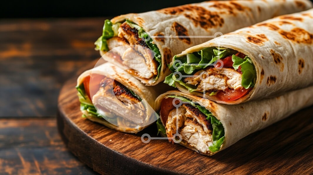 Υπάρχει δυνατότητα προσωποποίησης με δική σας φωτογραφία και προσαρμογής διαστάσεων κατόπιν παραγγελίας. Το συγεκεριμενο puzzle παρουσιαζει Η εικόνα παρουσιάζει νόστιμα περιτυλίγματα κοτόπουλου τακτοποιημένα σε μια ξύλινη πιατέλα σερβιρίσματος. Κάθε περιτύλιγμα είναι γεμάτο με ψητό κοτόπουλο, φρέσκο μαρούλι και ντομάτες σε φέτες, όλα σφιχτά τυλιγμένα σε φρυγανισμένο ψωμί. Τα ζεστά χρώματα του ψητού κοτόπουλου έρ