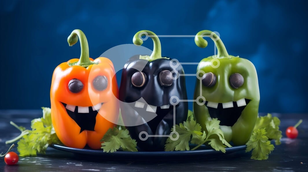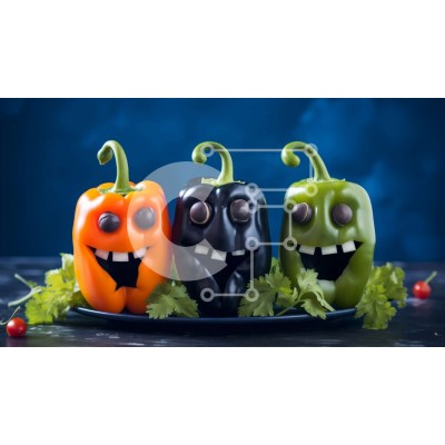 Υπάρχει δυνατότητα προσωποποίησης με δική σας φωτογραφία και προσαρμογής διαστάσεων κατόπιν παραγγελίας. Το συγεκεριμενο puzzle παρουσιαζει Αυτή η εικόνα παρουσιάζει τρεις πολύχρωμες πιπεριές σε ένα μπλε πιάτο. Οι πιπεριές έχουν ζωγραφισμένα τα πρόσωπα και το στόμα τους για να φαίνονται σαν να χαμογελούν. Τοποθετούνται πάνω από μερικά πράσινα φύλλα, τα οποία μπορεί να αποτελούν μέρος της γαρνιτούρας για το πιάτο.