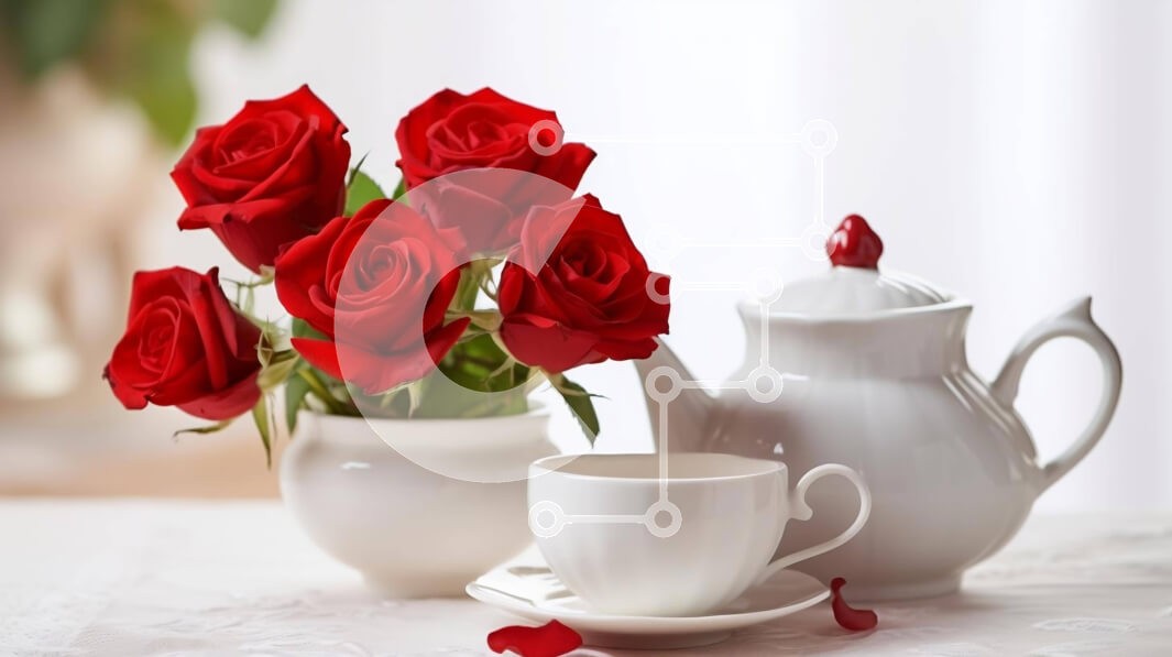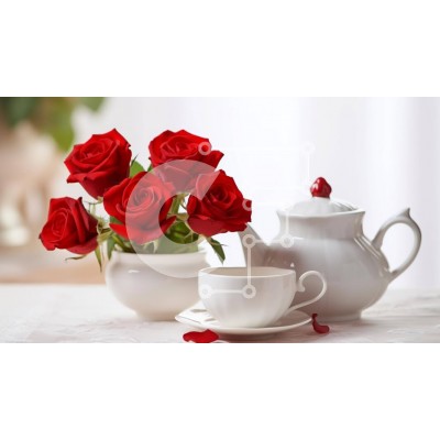 Υπάρχει δυνατότητα προσωποποίησης με δική σας φωτογραφία και προσαρμογής διαστάσεων κατόπιν παραγγελίας. Το συγεκεριμενο puzzle παρουσιαζει Η εικόνα απεικονίζει μια λευκή τσαγιέρα και ένα φλιτζάνι σε ένα τραπέζι, συνοδευόμενα από κόκκινα τριαντάφυλλα τοποθετημένα σε βάζα. Υπάρχει επίσης ένα άδειο φλιτζάνι τσαγιού, μαζί με διάσπαρτες χαρτοπετσέτες, δημιουργώντας μια ζεστή και φιλόξενη ατμόσφαιρα. Ένα μοναδικό puzz