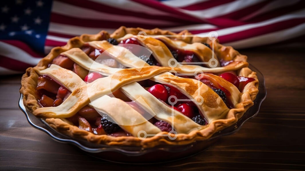 Υπάρχει δυνατότητα προσωποποίησης με δική σας φωτογραφία και προσαρμογής διαστάσεων κατόπιν παραγγελίας. Το συγεκεριμενο puzzle παρουσιαζει Αυτή η εικόνα παρουσιάζει μια πίτα στολισμένη με δικτυωτά πλέγματα, που κάθεται πάνω από μια αμερικανική σημαία. Η πίτα περιέχει διάφορα φρούτα όπως φράουλες, σμέουρα και βατόμουρα. Ένα μοναδικό puzzle που συνδυάζει ποιότητα, αισθητική και εμπειρία. Υλικό: Κατασκευασμένο από