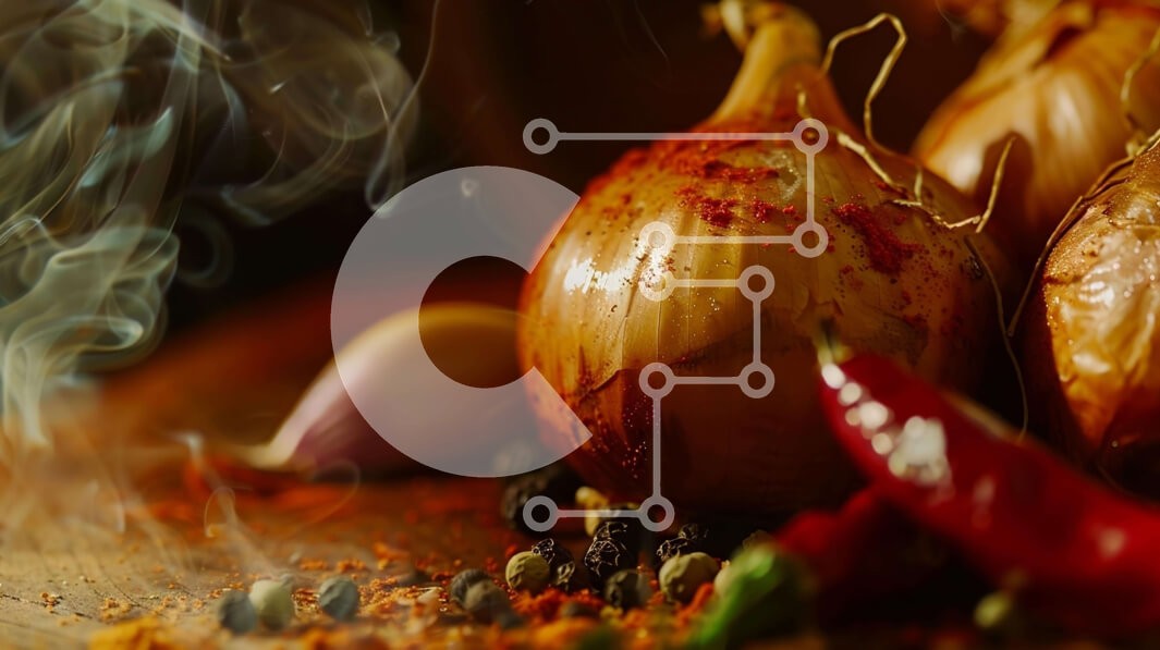 Υπάρχει δυνατότητα προσωποποίησης με δική σας φωτογραφία και προσαρμογής διαστάσεων κατόπιν παραγγελίας. Το συγεκεριμενο puzzle παρουσιαζει Η εικόνα παρουσιάζει πολλά κρεμμύδια, πιπεριές και τσίλι σε ένα ξύλινο τραπέζι. Ο καπνός φαίνεται να βγαίνει από την κορυφή του τραπεζιού, υποδηλώνοντας ότι τα υλικά μαγειρεύονται ή προετοιμάζονται. Επιπλέον, υπάρχει κάποιο είδος υγρού στην εικόνα, το οποίο μπορεί να υποδεικνύ