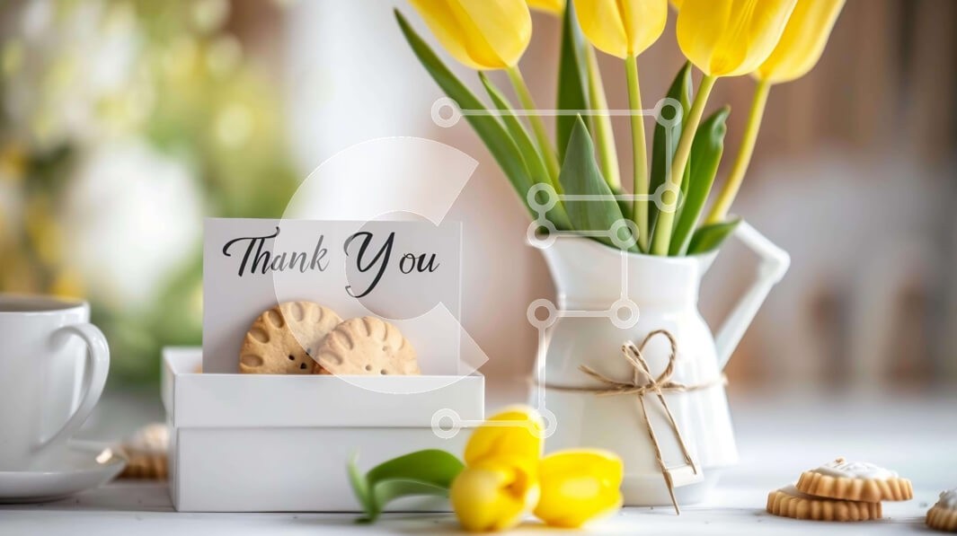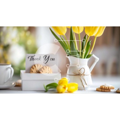 Υπάρχει δυνατότητα προσωποποίησης με δική σας φωτογραφία και προσαρμογής διαστάσεων κατόπιν παραγγελίας. Το συγεκεριμενο puzzle παρουσιαζει Αυτή η εικόνα παρουσιάζει ένα σκηνικό τραπεζιού με ένα βάζο γεμάτο με κίτρινες τουλίπες, μπισκότα και μια άδεια ευχαριστήρια κάρτα. Στο τραπέζι υπάρχει επίσης ένα φλιτζάνι καφέ και δίπλα στο βάζο υπάρχουν πολλά ασημικά, όπως πιρούνια και κουτάλια. Ένα μοναδικό puzzle που συνδ