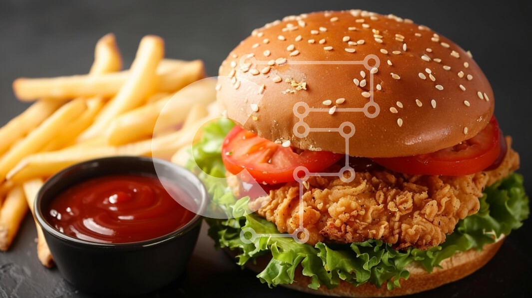 Υπάρχει δυνατότητα προσωποποίησης με δική σας φωτογραφία και προσαρμογής διαστάσεων κατόπιν παραγγελίας. Το συγεκεριμενο puzzle παρουσιαζει Αυτή η εικόνα παρουσιάζει ένα υπέροχο σάντουιτς φτιαγμένο με ένα κουλούρι σουσαμιού που είναι γεμάτο με τραγανό τηγανητό κοτόπουλο, φρέσκο μαρούλι και φέτες ντομάτας. Συνοδεύεται από μια μερίδα χρυσαφένιες πατάτες και ένα μικρό μπολ κέτσαπ για βουτιά. Η σκηνή παρουσιάζεται σ