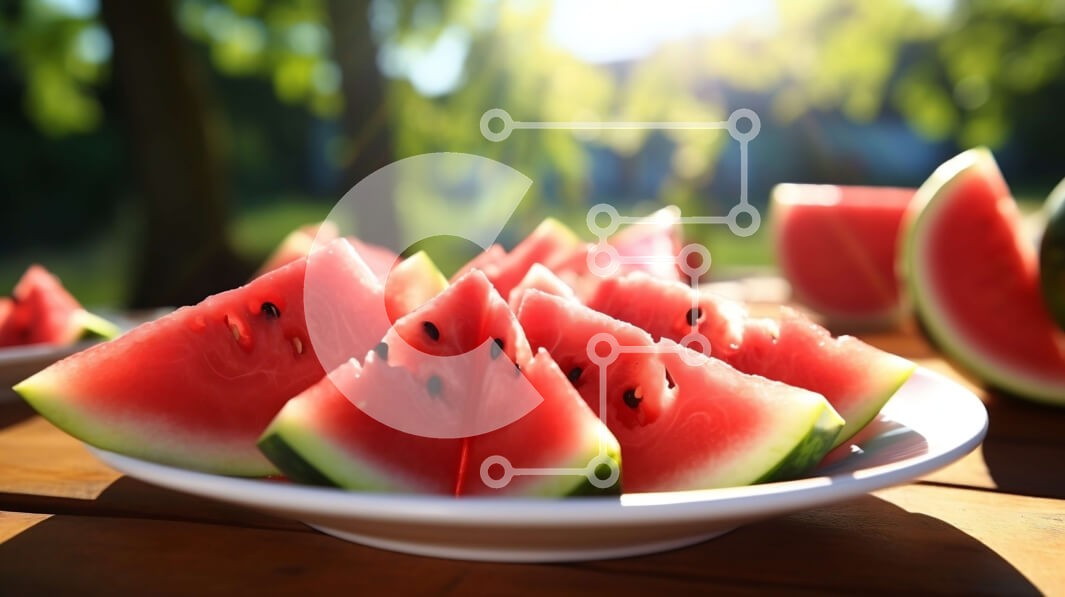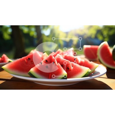 Υπάρχει δυνατότητα προσωποποίησης με δική σας φωτογραφία και προσαρμογής διαστάσεων κατόπιν παραγγελίας. Το συγεκεριμενο puzzle παρουσιαζει Αυτή η εικόνα παρουσιάζει ένα πιάτο με κομμένο καρπούζι, τοποθετημένο σε κύκλο σε ένα ξύλινο τραπέζι. Οι φέτες καρπούζι έχουν μια ζωντανή απόχρωση του ροζ και έχουν σταγόνες νερού πάνω τους, αντανακλώντας το φως του ήλιου. Το τραπέζι είναι καλυμμένο με ένα λευκό τραπεζομάντιλο