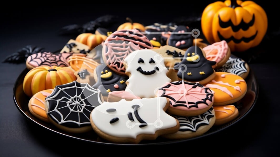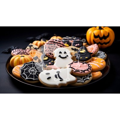 Υπάρχει δυνατότητα προσωποποίησης με δική σας φωτογραφία και προσαρμογής διαστάσεων κατόπιν παραγγελίας. Το συγεκεριμενο puzzle παρουσιαζει Αυτή η εικόνα δείχνει ένα μαύρο πιάτο γεμάτο με διάφορα μπισκότα με θέμα το Halloween, συμπεριλαμβανομένων κολοκύθες, φαντάσματα και νυχτερίδες. Τα μπισκότα τοποθετούνται πάνω από ένα πορτοκαλί τραπεζομάντιλο, δημιουργώντας μια οπτικά ελκυστική σκηνή. Στο βάθος διακρίνονται δύ