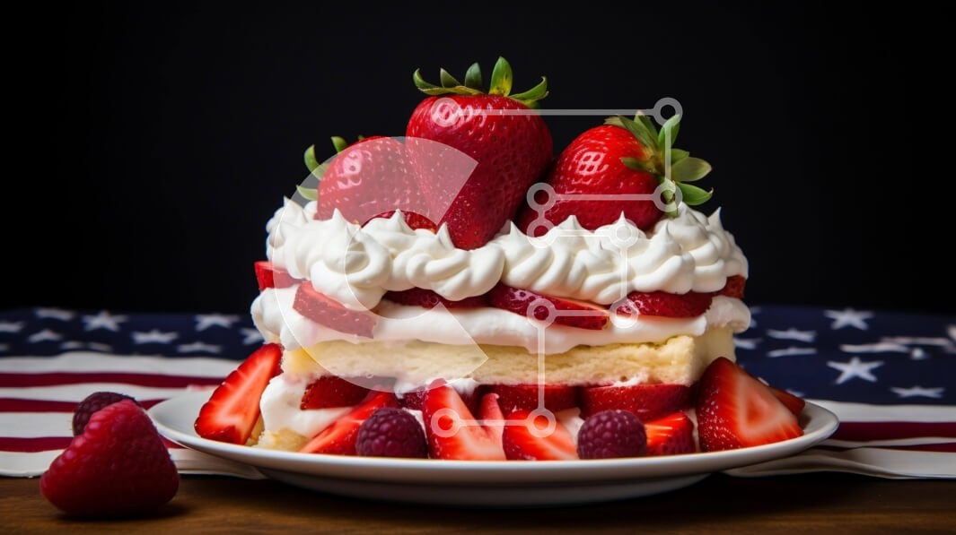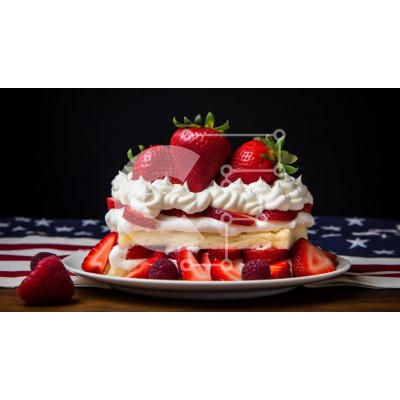 Υπάρχει δυνατότητα προσωποποίησης με δική σας φωτογραφία και προσαρμογής διαστάσεων κατόπιν παραγγελίας. Το συγεκεριμενο puzzle παρουσιαζει Αυτή η εικόνα παρουσιάζει μια λευκή τούρτα στολισμένη με φράουλες, σαντιγί και μια αμερικανική σημαία από πάνω. Η τούρτα είναι τοποθετημένη μπροστά από την αμερικανική σημαία, ορατή από διάφορες γωνίες σε όλη την εικόνα. Μικρά κομμάτια φρούτων είναι διάσπαρτα γύρω από το κέικ,