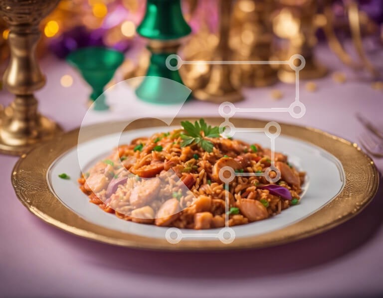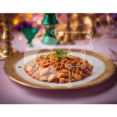 Υπάρχει δυνατότητα προσωποποίησης με δική σας φωτογραφία και προσαρμογής διαστάσεων κατόπιν παραγγελίας. Το συγεκεριμενο puzzle παρουσιαζει Αυτή η εικόνα δείχνει ένα πιάτο σε χρυσό χρώμα γεμάτο με έναν απολαυστικό συνδυασμό από ρύζι, φασόλια και μπιζέλια. Το τραπέζι είναι στρωμένο με πιρούνι και κουτάλι, υποδεικνύοντας ότι το γεύμα είναι έτοιμο για απόλαυση. Γύρω από το πιάτο υπάρχουν διάφορα διακοσμητικά αντικείμ