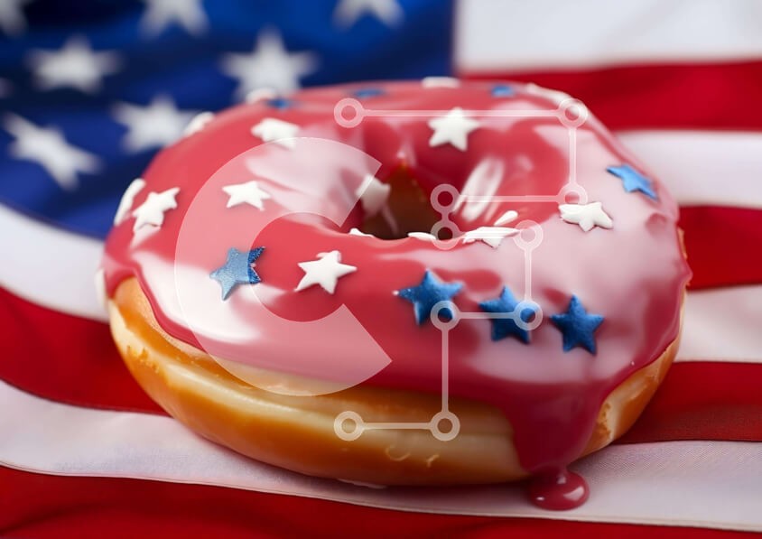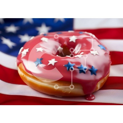 Υπάρχει δυνατότητα προσωποποίησης με δική σας φωτογραφία και προσαρμογής διαστάσεων κατόπιν παραγγελίας. Το συγεκεριμενο puzzle παρουσιαζει Η εικόνα παρουσιάζει ένα ντόνατ με κόκκινο, λευκό και μπλε γλάσο που κάθεται πάνω σε φόντο αμερικανικής σημαίας. Το ντόνατ είναι διακοσμημένο με αστέρια και ρίγες, κάτι που προσθέτει στη συνολική πατριωτική αίσθηση της εικόνας. Μπορεί να βρεθεί σε διάφορα σημεία γύρω από το δω