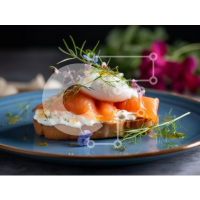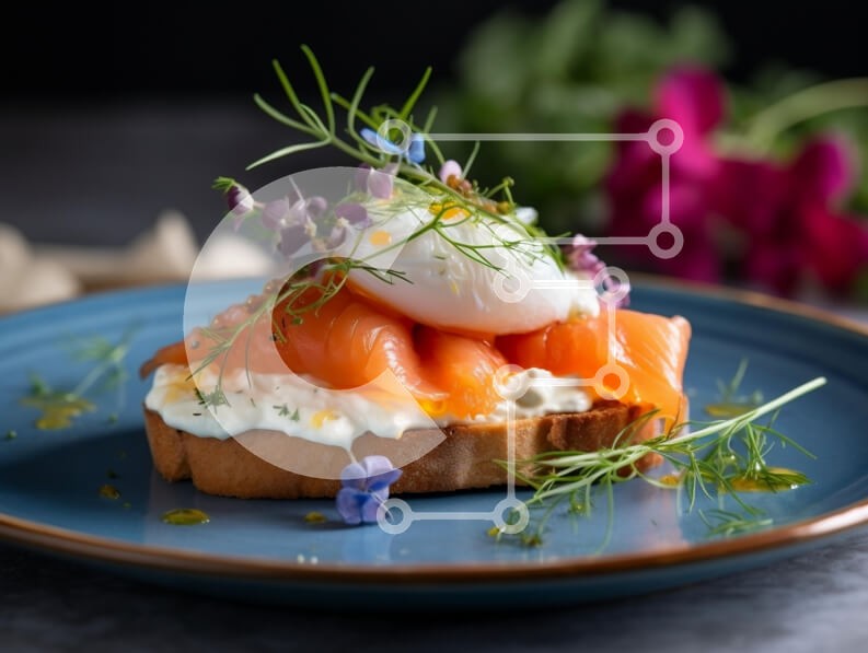 Υπάρχει δυνατότητα προσωποποίησης με δική σας φωτογραφία και προσαρμογής διαστάσεων κατόπιν παραγγελίας. Το συγεκεριμενο puzzle παρουσιαζει Αυτή η εικόνα παρουσιάζει ένα όμορφα επιμεταλλωμένο πιάτο με μια φέτα ψωμί με τυρί κρέμα, καπνιστό σολομό και ένα αυγό ποσέ. Το πιάτο είναι διακοσμημένο με φρέσκα βότανα, συμπεριλαμβανομένου του άνηθου και των μικρών μοβ λουλουδιών, προσθέτοντας μια ζωηρή πινελιά. Το πιάτο τοπ