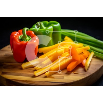 Υπάρχει δυνατότητα προσωποποίησης με δική σας φωτογραφία και προσαρμογής διαστάσεων κατόπιν παραγγελίας. Το συγεκεριμενο puzzle παρουσιαζει Αυτή η εικόνα παρουσιάζει μια ζωντανή διάταξη από φρέσκα λαχανικά σε μια ξύλινη σανίδα κοπής. Η εστίαση είναι σε τρεις πιπεριές: μια έντονο κόκκινο και μια πράσινη, τοποθετημένες σε όρθια θέση, δίπλα σε πολλές λωρίδες κίτρινης και πορτοκαλί πιπεριάς. Τα κρεμμύδια είναι επίσης