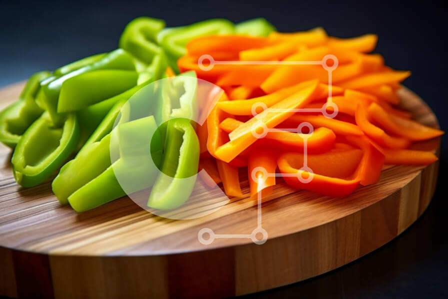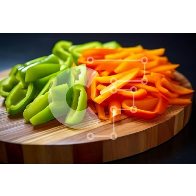 Υπάρχει δυνατότητα προσωποποίησης με δική σας φωτογραφία και προσαρμογής διαστάσεων κατόπιν παραγγελίας. Το συγεκεριμενο puzzle παρουσιαζει Η εικόνα παρουσιάζει μια ξύλινη σανίδα κοπής που εμφανίζει ζωντανές φέτες από πράσινες και πορτοκαλί πιπεριές. Οι πράσινες πιπεριές κόβονται σε χοντρές λωρίδες, αναδεικνύοντας την τραγανή υφή και το φρέσκο χρώμα τους. Αντίθετα, οι πορτοκαλί πιπεριές κόβονται σε πιο λεπτά, μα