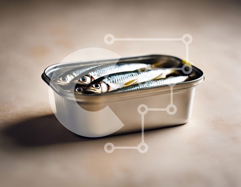 Υπάρχει δυνατότητα προσωποποίησης με δική σας φωτογραφία και προσαρμογής διαστάσεων κατόπιν παραγγελίας. Το συγεκεριμενο puzzle παρουσιαζει Η εικόνα παρουσιάζει ένα μικρό, ορθογώνιο κουτί από κασσίτερο που περιέχει πολλά μικρά ψάρια. Τα ψάρια είναι ασημένια με γυαλιστερά λέπια και προεξέχοντα μάτια, τακτοποιημένα μέσα στο κουτί. Το κουτί είναι μεταλλικό και φαίνεται να είναι σφραγισμένο, να στηρίζεται σε μια μαλακ