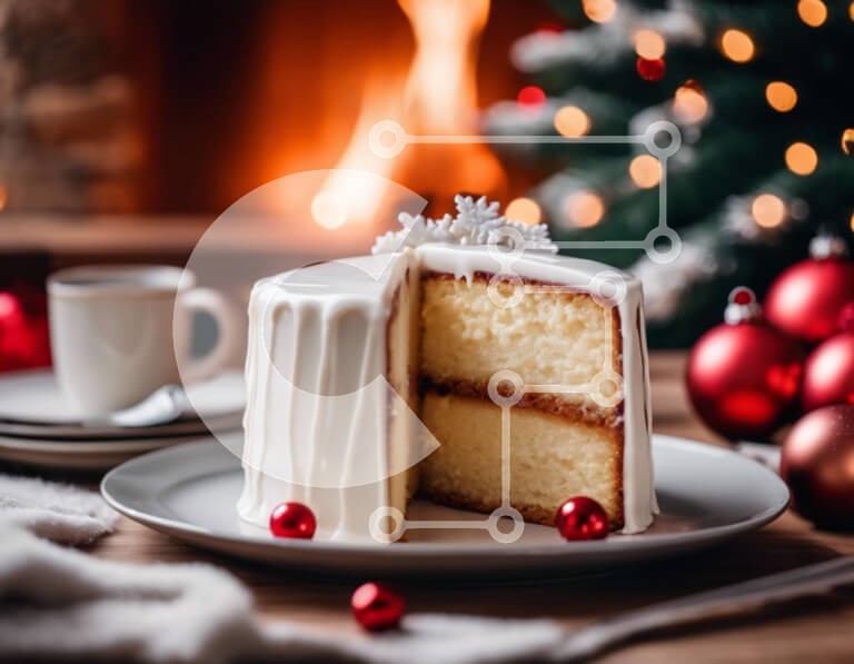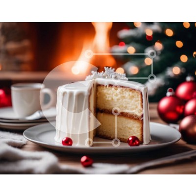Υπάρχει δυνατότητα προσωποποίησης με δική σας φωτογραφία και προσαρμογής διαστάσεων κατόπιν παραγγελίας. Το συγεκεριμενο puzzle παρουσιαζει Αυτή η εικόνα δείχνει ένα λευκό κέικ με μια φέτα κομμένη στη μέση, τοποθετημένη πάνω από ένα άδειο πιάτο. Γύρω από την τούρτα υπάρχουν χριστουγεννιάτικα δέντρα, στολίδια και φωτάκια, δημιουργώντας μια εορταστική ατμόσφαιρα. Υπάρχει επίσης ένα φλιτζάνι στο πιάτο, υποδηλώνοντας