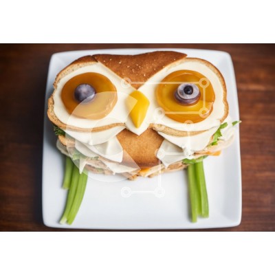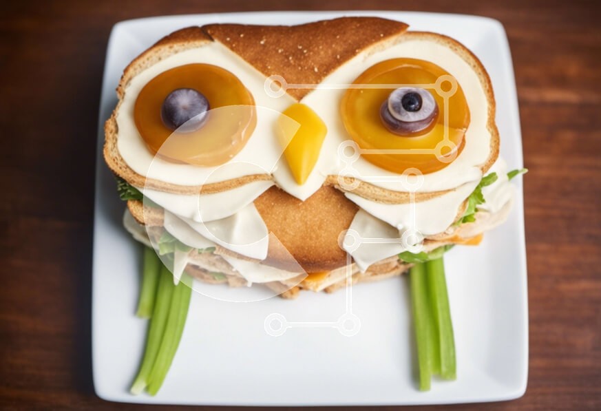 Υπάρχει δυνατότητα προσωποποίησης με δική σας φωτογραφία και προσαρμογής διαστάσεων κατόπιν παραγγελίας. Το συγεκεριμενο puzzle παρουσιαζει Αυτή η εικόνα παρουσιάζει ένα σάντουιτς σε σχήμα κουκουβάγιας σε ένα λευκό πιάτο, συνοδευόμενο από πράσινα λαχανικά, όπως καρότα και σέλινο. Το σάντουιτς είναι σχολαστικά διακοσμημένο για να θυμίζει μάτι, παρέχοντας μια ιδιότροπη πινελιά στο γεύμα. Τα μάτια είναι φτιαγμένα με