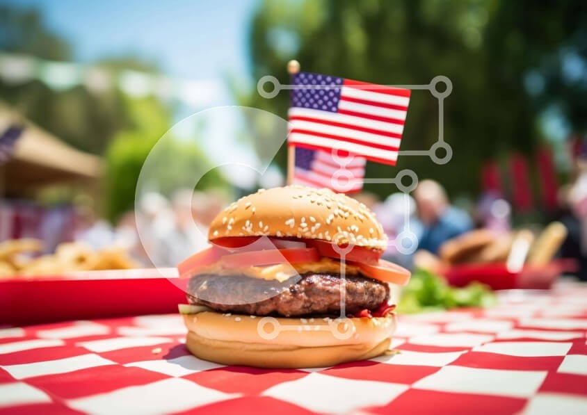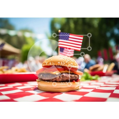 Υπάρχει δυνατότητα προσωποποίησης με δική σας φωτογραφία και προσαρμογής διαστάσεων κατόπιν παραγγελίας. Το συγεκεριμενο puzzle παρουσιαζει Η εικόνα δείχνει ένα μπέργκερ που κάθεται πάνω από μια αμερικανική σημαία, η οποία φαίνεται στο ερυθρόλευκο καρό τραπεζομάντιλο. Υπάρχουν πολλά άλλα τρόφιμα που τοποθετούνται γύρω από το τραπέζι, όπως πατατάκια, λαχανοσαλάτα και πατάτες. Το χάμπουργκερ είναι πιθανό να έχει σερ